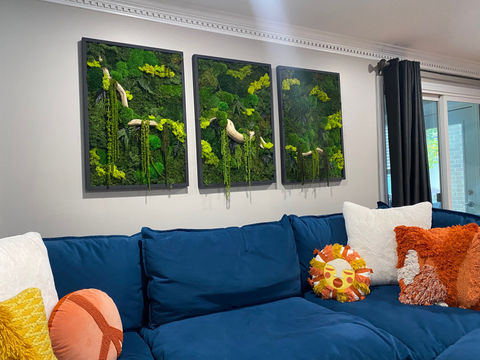My art is designed and created by using preserved moss- which means they require zero light and zero water! Simply hang your wall and enjoy for 10 years or more! Keep out of direct sunlight and out of high steam areas like bathrooms or hot sunrooms.